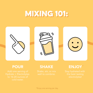 HOW TO USE: Add one serving of Hydrate + Electrolytes to 16-20 oz. of cold water. Mix well and enjoy one serving per day.