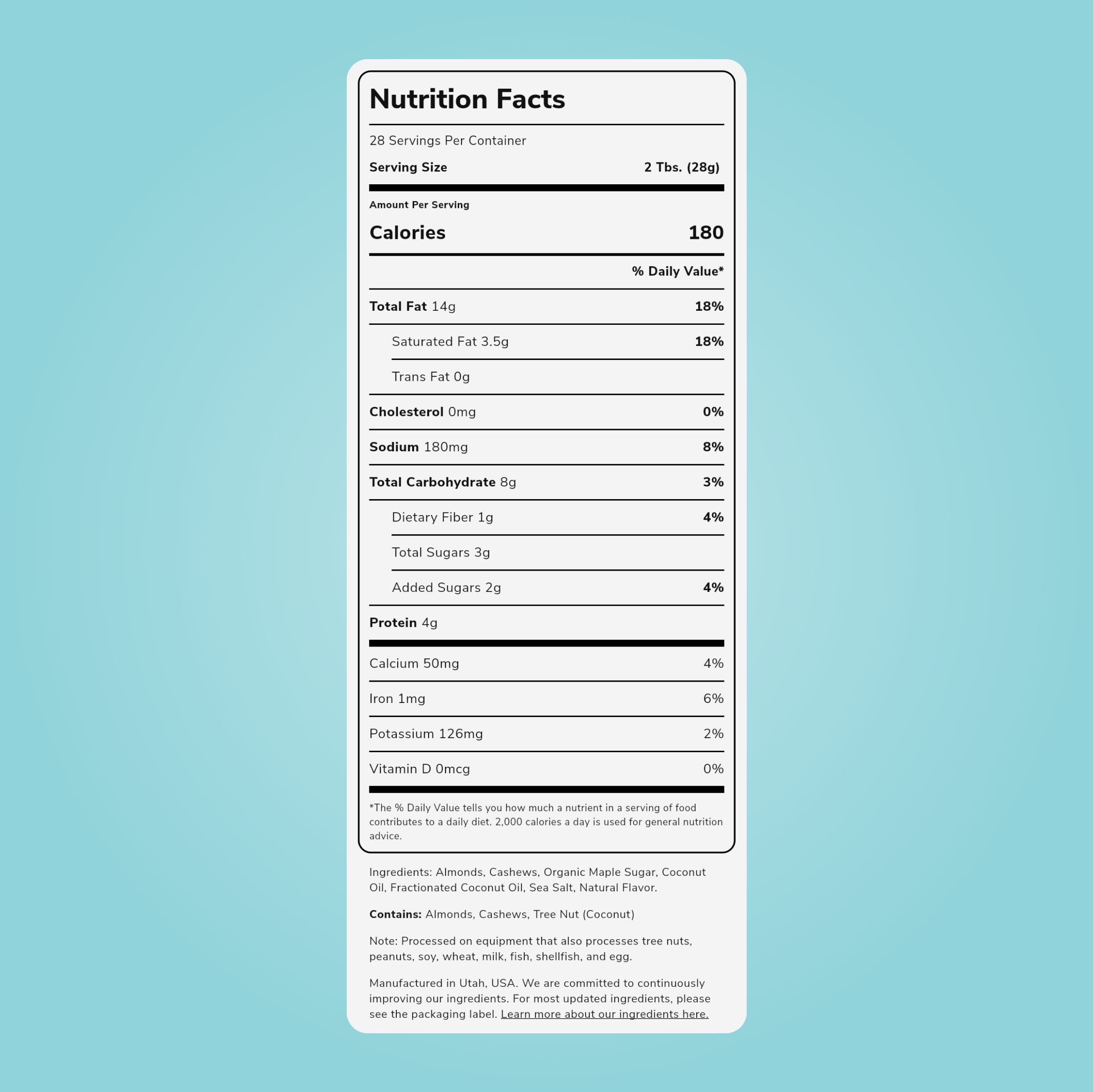 ALL-NATURAL CLEAN INGREDIENTS: Made with natural flavors. healthy fats. and packed with protein. this gourmet nut butter is a blend of roasted almonds and cashews. rich caramel flavoring. and a sprinkle of sea salt all ground together.